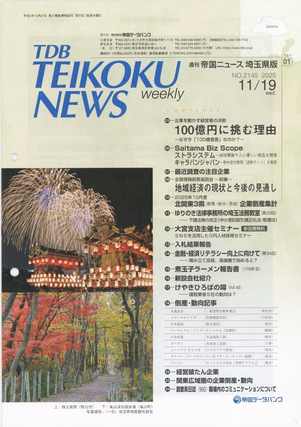 株式会社萬年は、このたび、株式会社帝国データバンクが発行する『週刊 帝国ニュース 埼玉県版』2025年11月19日号(No.2145)の特集記事「100億円に挑む理由」において、当社代表・望月雄太のインタビューが掲載されましたことをお知らせいたします 。